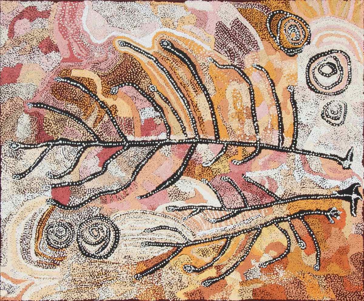 Nellie Ngampa Coulthard’s Tjuntala Ngurangka – Country with Wattle (Acacia Murrayana) is a celebration of the beauty of nature and the artist’s abiding connection to her ancestral lands. It is an exuberant, joyful evocation of Yankunytjatjara Country, especially the brilliant yellow blossoms of the acacia wattle tree that abound there.