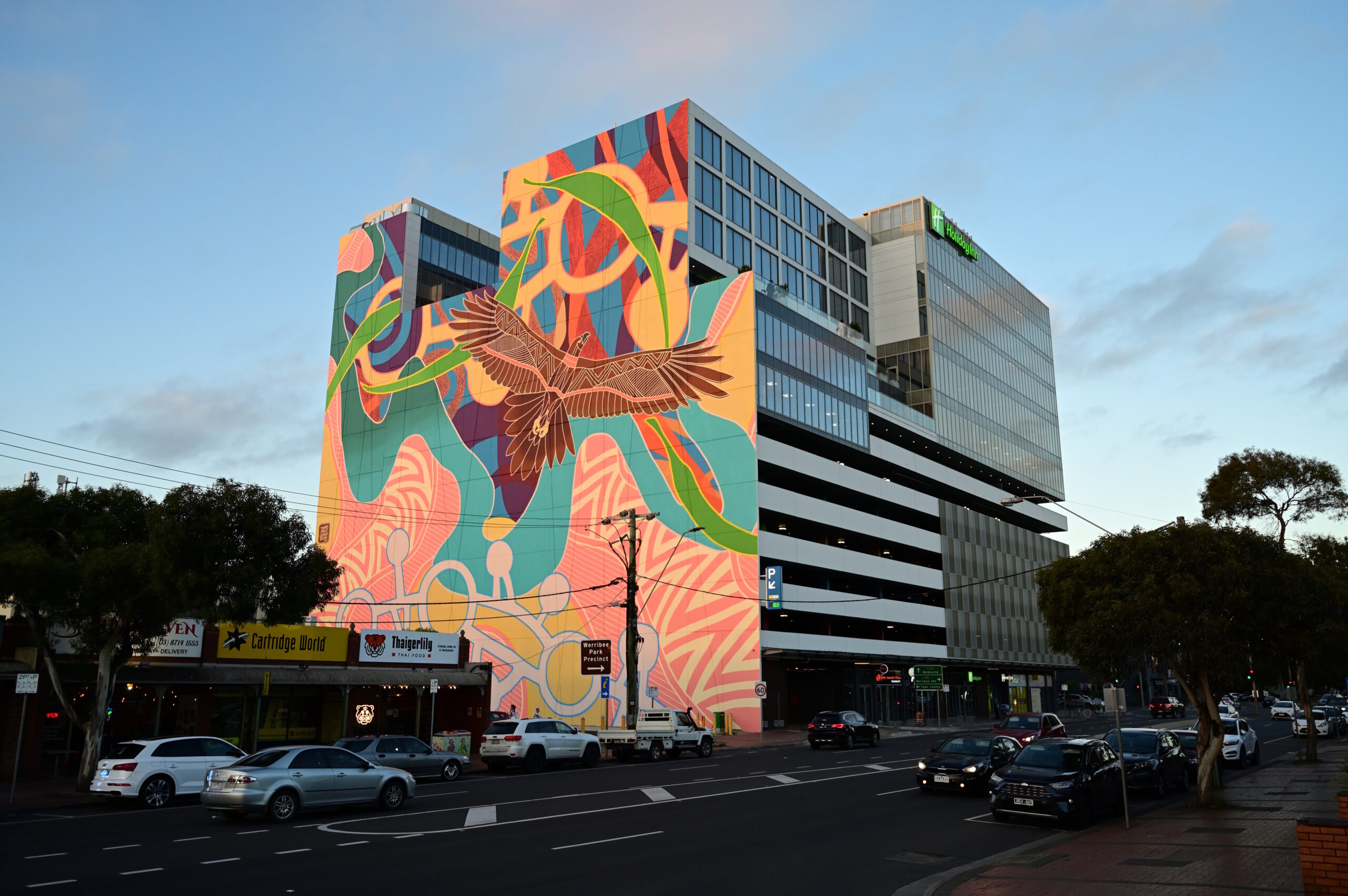 Stretching across the facade of the Holiday Inn Werribee, also known as the Hunter Building, at 22 Synnot Street, ‘Mooroop Yarkeen’ translates to ‘Spirit Dreaming.’ It took Tommy Day 12 days to bring this monumental vision to life, making it a striking addition to Werribee’s cityscape.