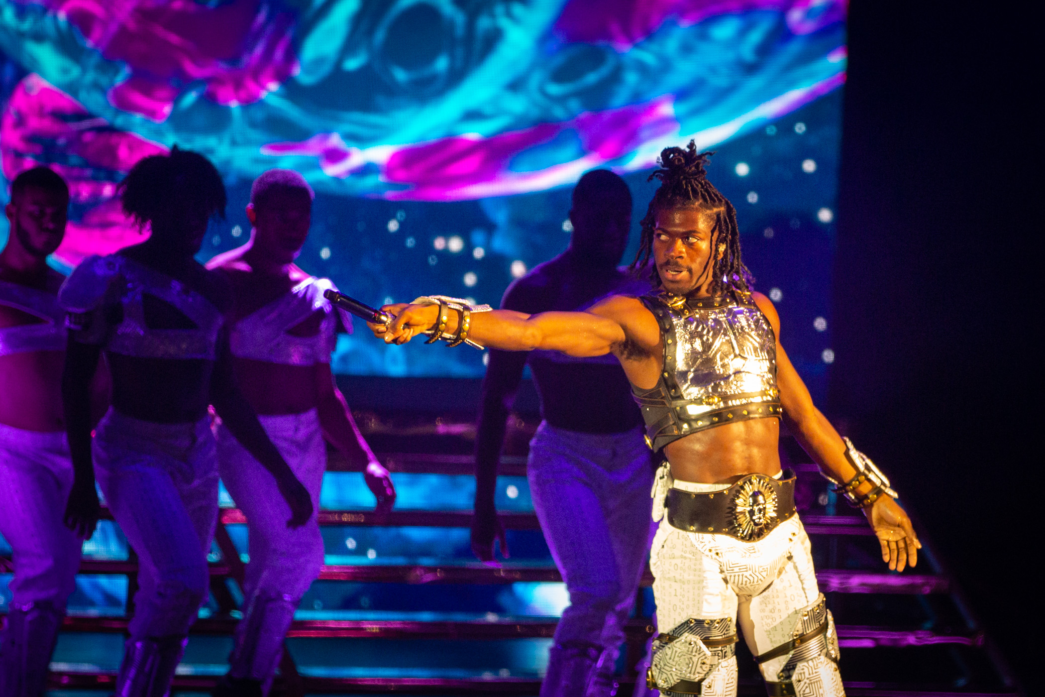 In a humbling moment, Lil Nas X shared he was nervous about performing his “first show in months” before diving into three theatrical acts filled with cuts from his debut album Montero including ‘Sun Goes Down’, ‘Dead Right Now’, ‘Don’t Want It’, ‘Lost in the Citadel’ and ‘That’s What I Want’. Of course, the 16 x Platinum remix with Billy Ray Cyrus in ‘Old Town Road’ was a crowd favourite, (arriving complete with a golden horse and dancers in sexy cowboy outfits), before morphing into Ginuwine’s Pony complete with classic Magic Mike-style dance moves across the stage, ‘Pump It’ by the Black Eyed Peas and the rapper’s own ‘Rodeo’.